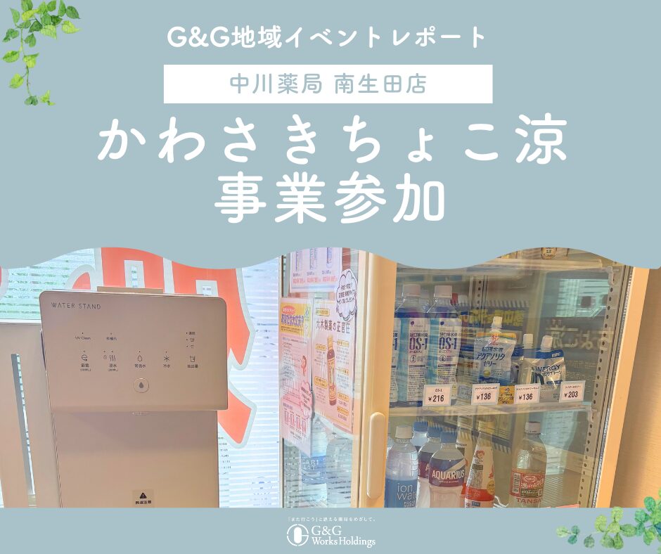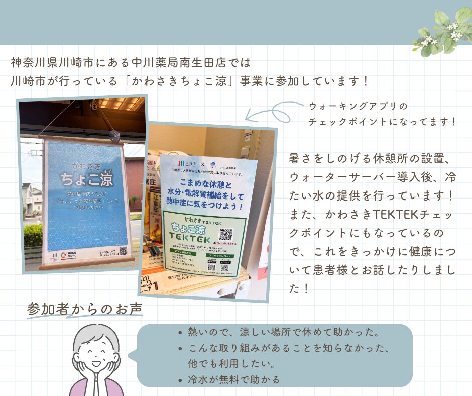 本活動は、川崎市が推進する「ちょこ涼」事業の一環として、中川薬局 南生田店にて実施されました。店舗内には冷房の効いた休憩スペースを設け、ウォーターサーバーの導入により冷水の提供を開始。さらに、ウォーキングアプリ「かわさきTEKTEK」のチェックポイントとしても機能し、地域住民の健康促進と交流の場として活用されました。処方箋がなくても気軽に立ち寄れる環境づくりを目指し、ポスター掲示などを通じて認知向上にも取り組みました。