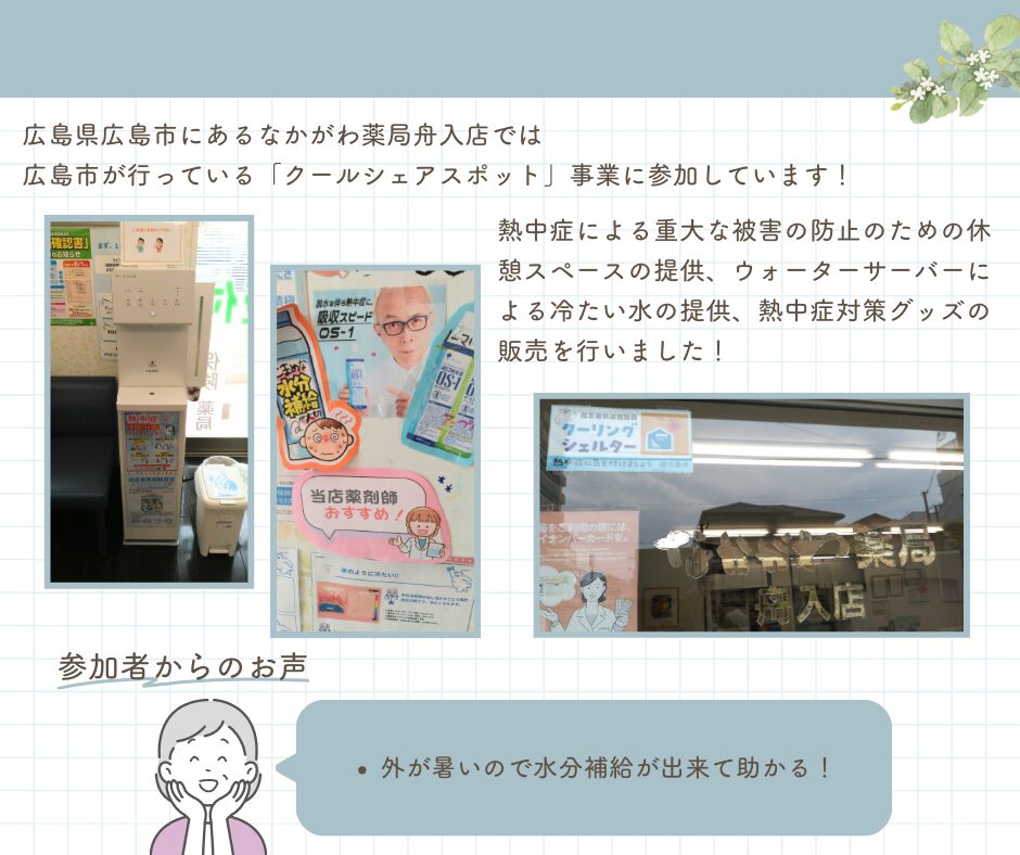 本活動は、広島市が推進する「クーリングシェルター」事業の一環として、なかがわ薬局 舟入店にて実施されました。熱中症による重大な被害を防ぐため、店舗内に冷房の効いた休憩スペースを設け、ウォーターサーバーによる冷水の提供を行いました。来局者が安心して水分補給と休息ができる環境を整えることで、地域の健康支援に貢献しました。