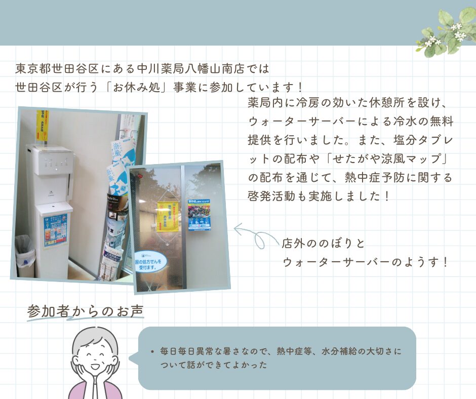 本活動は、世田谷区が推進する熱中症予防対策の一環として、地域住民が暑さを避けて休憩できる場所を提供する目的で実施されました。薬局内に冷房の効いた休憩所を設け、ウォーターサーバーによる冷水の無料提供を行いました。また、塩分タブレットの配布や「せたがや涼風マップ」の配布を通じて、熱中症予防に関する啓発活動も実施しました。
