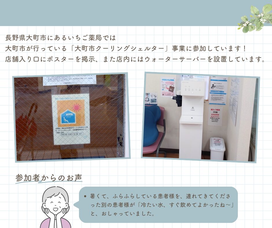 本活動は、猛暑による健康被害の予防を目的として、長野県大町市が推進する「クーリングシェルター」事業の一環として実施されました。いちご薬局では、外出時の危険な暑さを避けるため、冷房の効いた室内を地域住民に開放し、休憩場所として提供しました。来局者にはウォーターサーバーによる冷水を提供し、調剤の待ち時間や通院の合間に水分補給を促すことで、熱中症予防に寄与する取り組みとなりました。