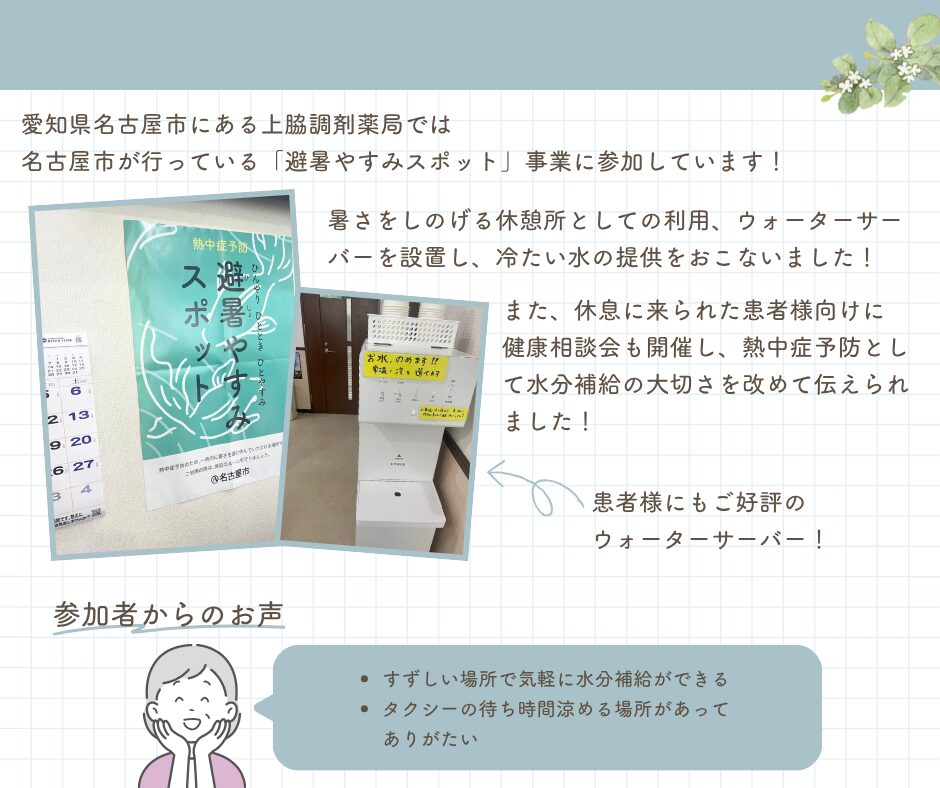 本活動は、名古屋市が推進する「避暑やすみスポット」事業の一環として、猛暑による健康被害の予防を目的に実施されました。薬局内に冷房の効いた休息スペースを整備し、地域住民が一時的に暑さを避けて休憩できる場所として開放しました。ウォーターサーバーによる冷水の提供も行い、薬の服用や水分補給の支援を通じて、熱中症予防と健康管理に寄与しました。また、ポスターを掲示することで、スポットの存在をわかりやすく周知しました。