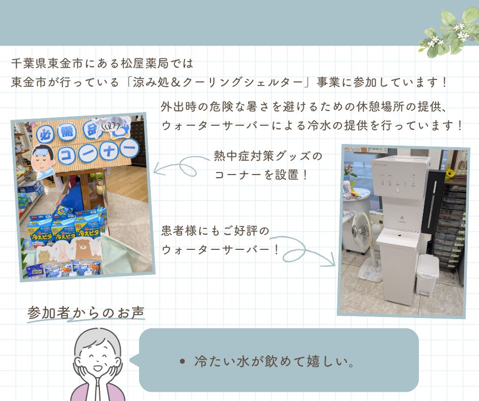 本活動は、猛暑による健康被害の予防を目的として、東金市が推進する「涼み処・クーリングシェルター」事業の一環として実施されました。松屋薬局では、冷房の効いた空間を地域住民に開放し、外出時の暑さを避けるための休憩場所を提供しました。また、ウォーターサーバーを設置し、来局者に冷水を提供することで、熱中症予防にも寄与する取り組みとなりました。