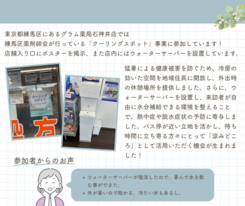 本活動は、練馬区薬剤師会が推進する「クーリングスポット」事業の一環として実施されました。