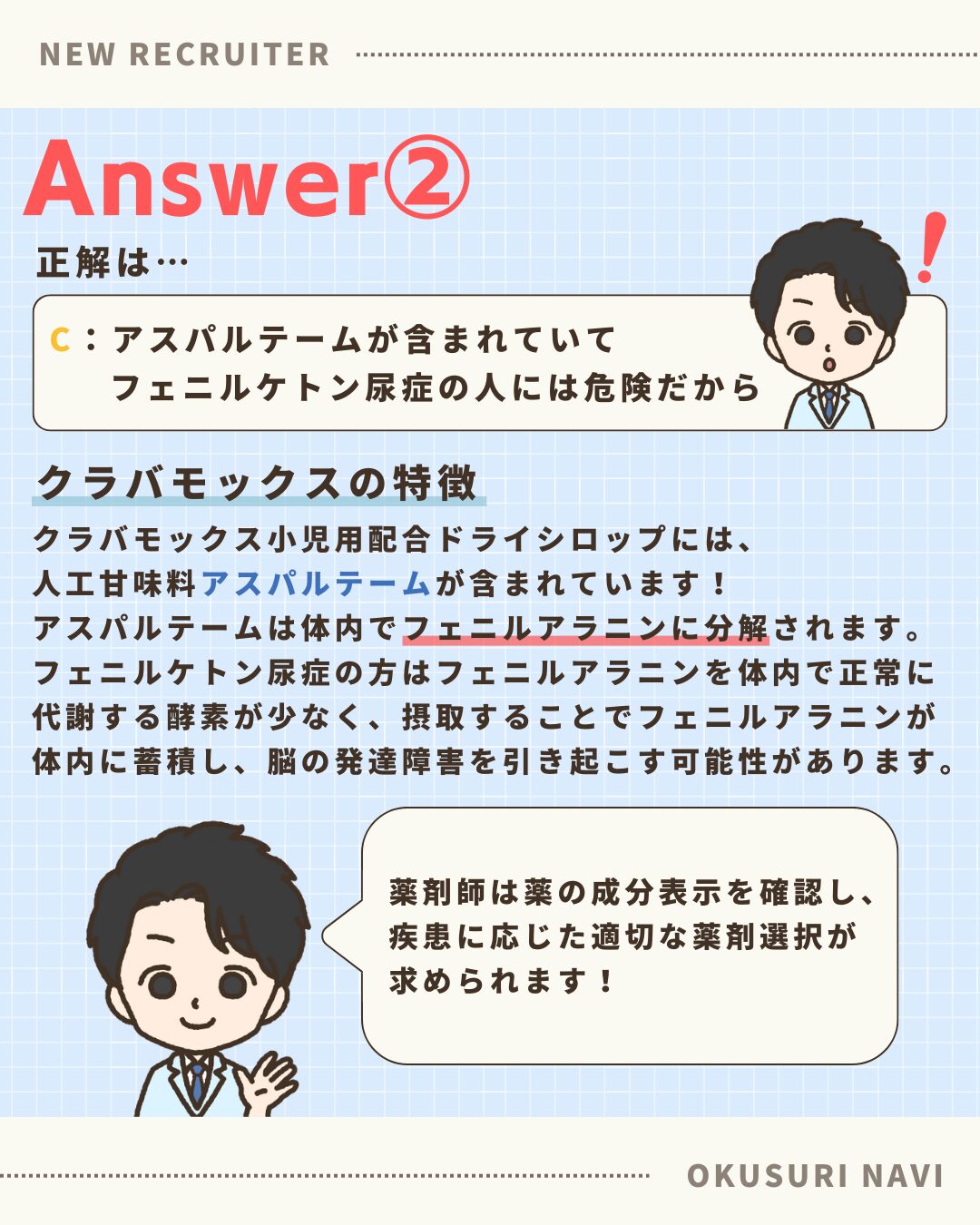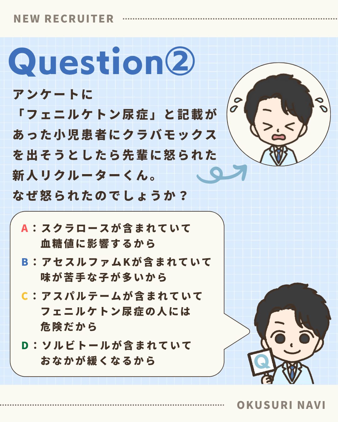 アンケートに「フェニルケトン尿症」と記載があった小児患者にクラバモックスを出そうとしたら、先輩に怒られた新人リクルーターくん。