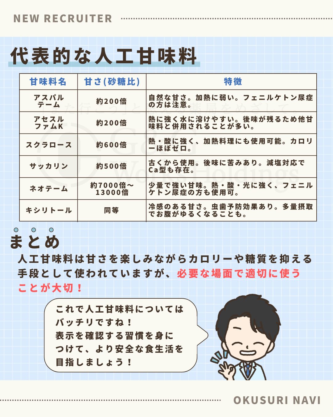 | ネオテーム | 約7000~13000倍 | 少量で強い甘味。熱・酸・光に強く、フェニルケトン尿症の方も使用可。 |
