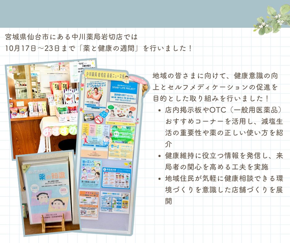 - 店内掲示板やOTC(一般用医薬品)おすすめコーナーを活用し、減塩生活の重要性や薬の正しい使い方を紹介