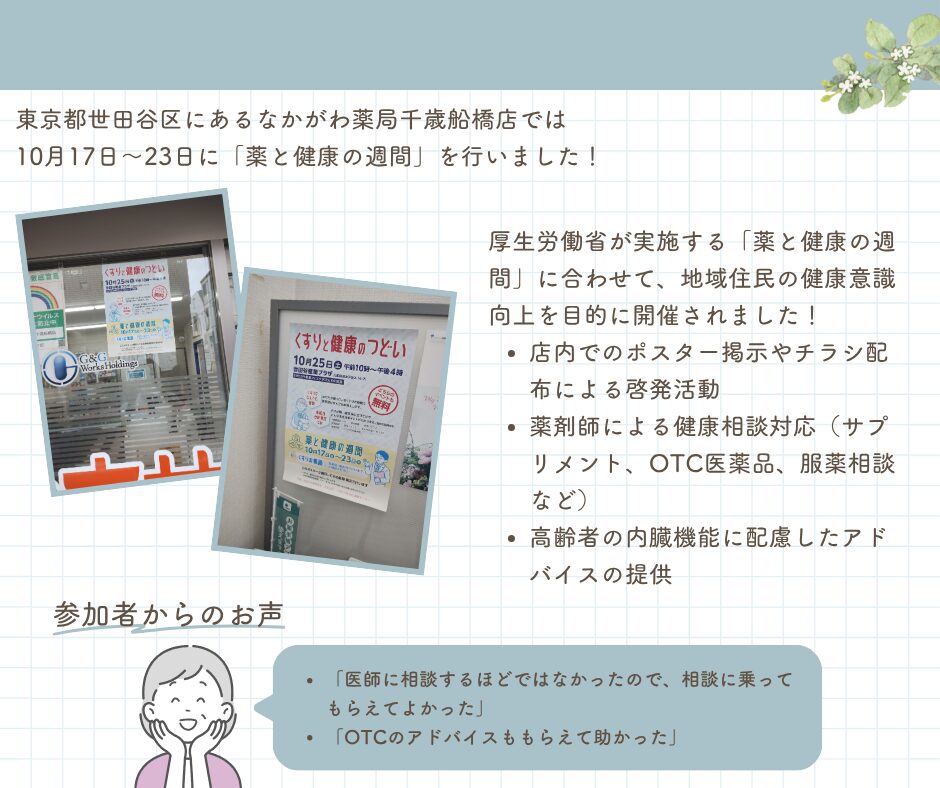 なかがわ薬局千歳船橋店では、薬と健康に関する相談対応や啓発活動を通じて、地域とのつながりを深めました。