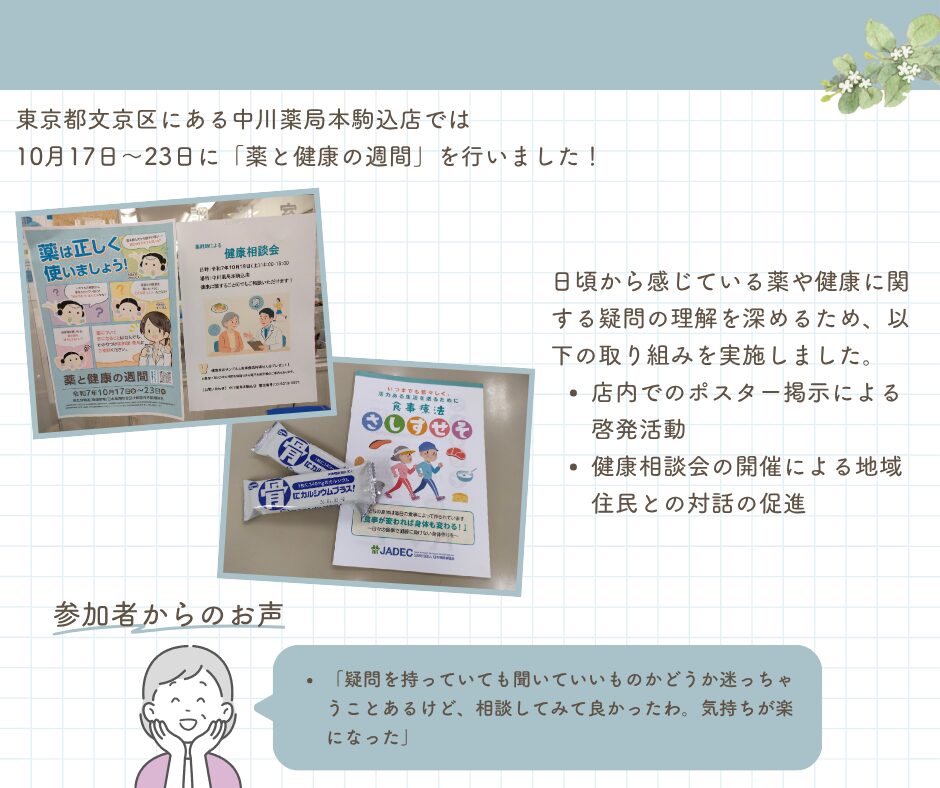 中川薬局本駒込店では、日頃から感じている薬や健康に関する疑問の理解を深めるため、以下の取り組みを実施しました。