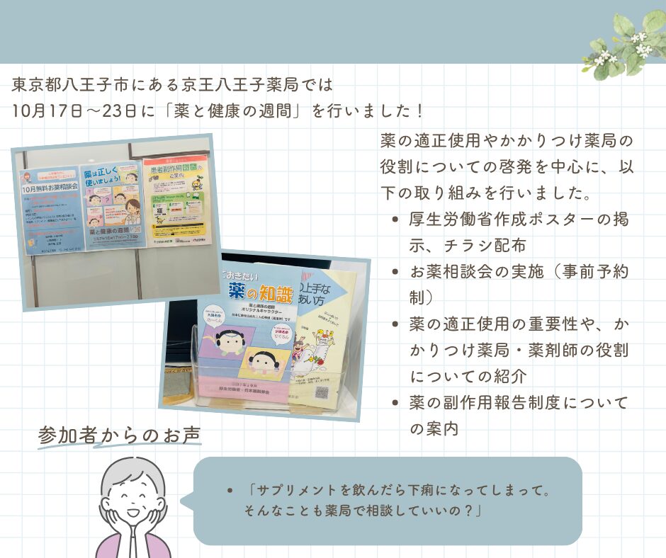 京王八王子薬局では、薬の適正使用やかかりつけ薬局の役割についての啓発を中心に、以下の取り組みを行いました。