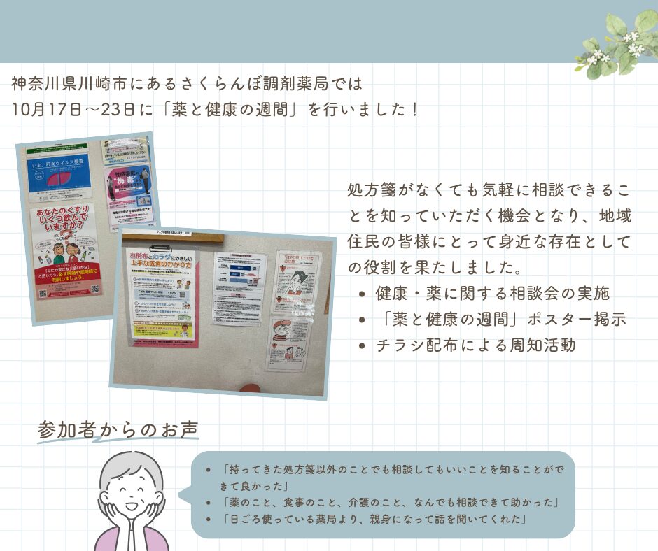 処方箋がなくても気軽に相談できることを知っていただく機会となり、地域住民の皆様にとって身近な存在としての役割を果たしました。