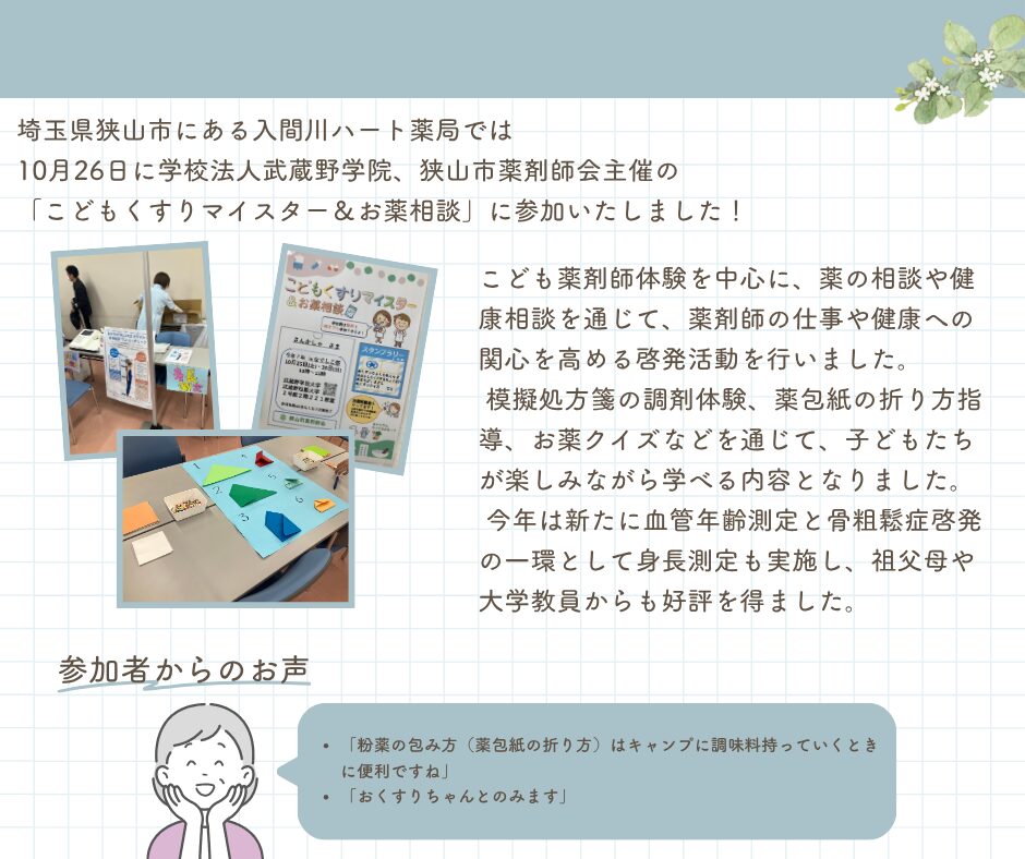 入間川ハート薬局「こども薬剤師体験・薬の相談・健康相談」参加について