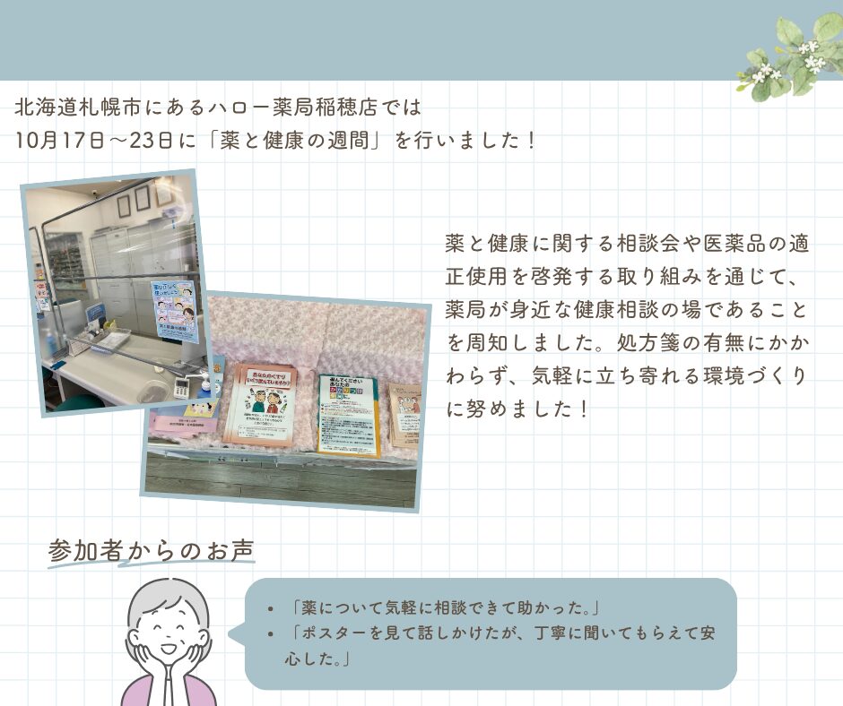 ハロー薬局 稲穂店では、薬と健康に関する相談会や医薬品の適正使用を啓発する取り組みを通じて、薬局が身近な健康相談の場であることを周知しました。処方箋の有無にかかわらず、気軽に立ち寄れる環境づくりに努めました。
