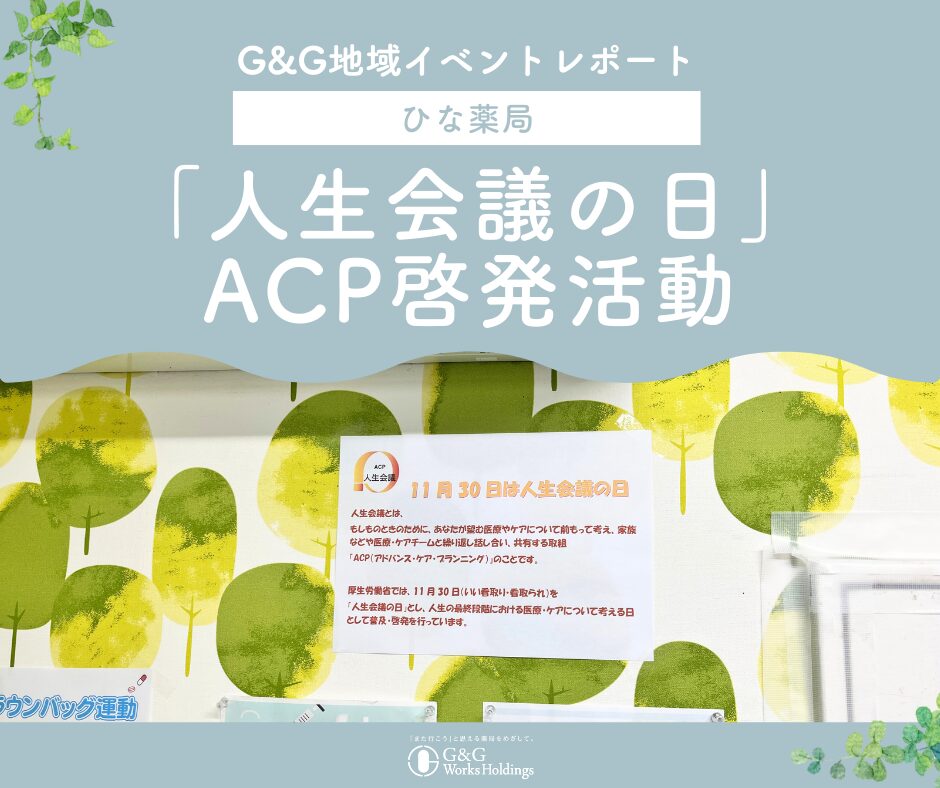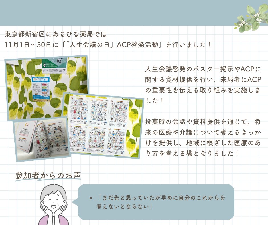 ひな薬局では、人生会議啓発のポスター掲示やACPに関する資材提供を行い、来局者にACPの重要性を伝える取り組みを実施しました。投薬時の会話や資料提供を通じて、将来の医療や介護について考えるきっかけを提供し、地域に根ざした医療のあり方を考える場となりました。