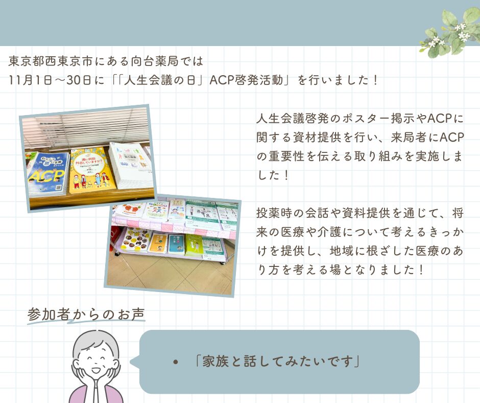 向台薬局では、ACPに関する資材提供を行い、来局者にACPの重要性を伝える取り組みを実施しました。投薬時の会話や資料提供を通じて、将来の医療や介護について考えるきっかけを提供し、地域に根ざした医療のあり方を考える場となりました。