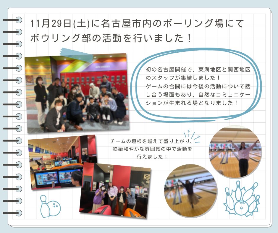 このたび、ボーリング部では社員同士の交流を深めることを目的としたイベントを開催いたしました。名古屋地区内の店舗から多くの社員が参加し、店舗・性別・年齢を問わず、さまざまなメンバーが一堂に会する貴重な機会となりました。ガーターやストライク、スペアが出るたびにチームの垣根を越えて盛り上がり、終始和やかな雰囲気の中で進行しました。ゲームの合間には今後の活動について話し合う場面もあり、自然なコミュニケーションが生まれる場となりました。