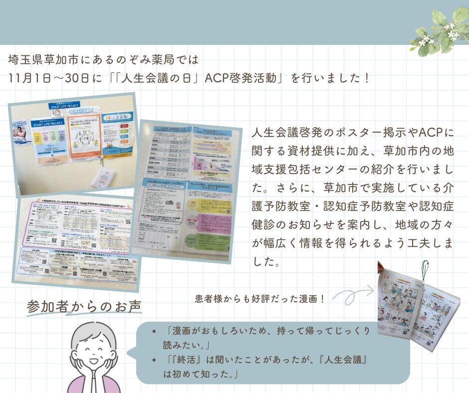 薬局では、人生会議啓発のポスター掲示やACPに関する資材提供に加え、草加市内の地域支援包括センターの紹介を行いました。さらに、草加市で実施している介護予防教室・認知症予防教室や認知症健診のお知らせを案内し、地域の方々が幅広く情報を得られるよう工夫しました。