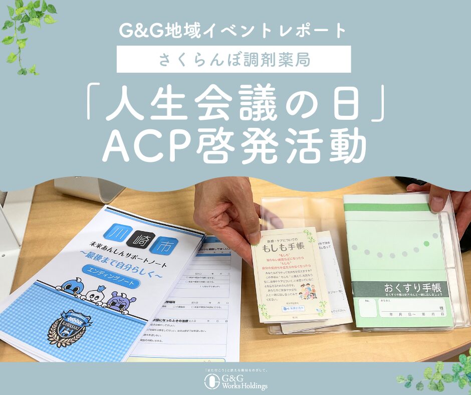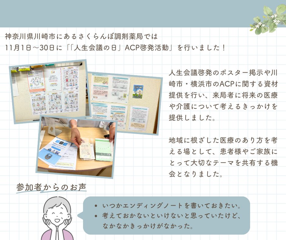 さくらんぼ調剤薬局では、人生会議啓発のポスター掲示や川崎市・横浜市のACPに関する資材提供を行い、来局者に将来の医療や介護について考えるきっかけを提供しました。地域に根ざした医療のあり方を考える場として、患者様やご家族にとって大切なテーマを共有する機会となりました。