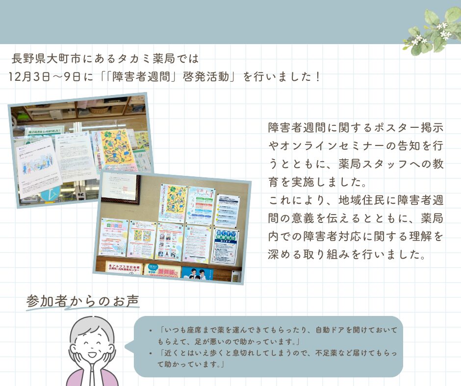《地域イベントレポート》 タカミ薬局 「障害者週間」啓発活動の実施