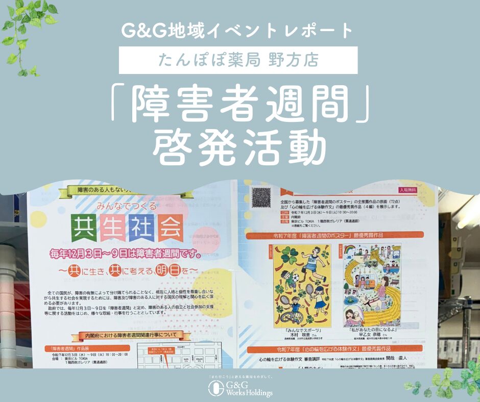 本活動は、内閣府が推進する「障害者週間」に合わせて、地域住民への啓発を目的として開催されました。たんぽぽ薬局野方店では、障害者週間のポスター掲示を行い、来局者に障害者週間の意義を伝える取り組みを実施しました。これにより、地域住民に共生社会について考えるきっかけを提供することができました。