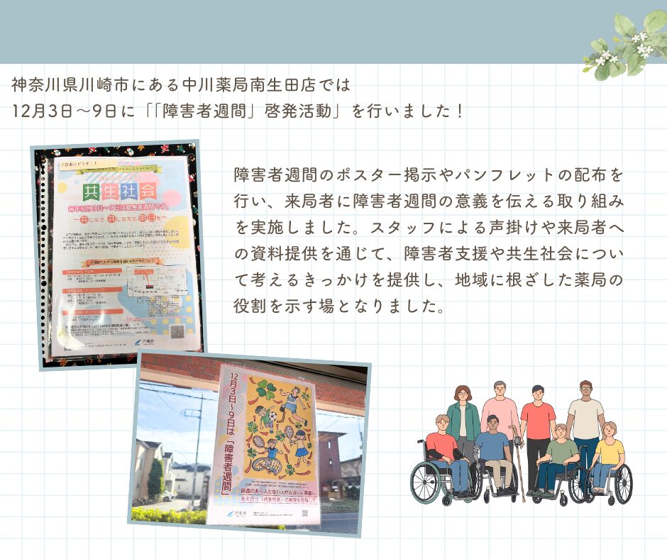 本活動は、内閣府が推進する「障害者週間」に合わせて、地域住民の障害者理解と共生社会への意識を高めることを目的に開催されました。中川薬局 南生田店では、障害者週間のポスター掲示やパンフレットの配布を行い、来局者に障害者週間の意義を伝える取り組みを実施しました。スタッフによる声掛けや来局者への資料提供を通じて、障害者支援や共生社会について考えるきっかけを提供し、地域に根ざした薬局の役割を示す場となりました。
