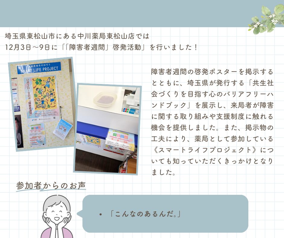 《地域イベントレポート》 中川薬局 東松山店 「障害者週間」啓発活動の実施