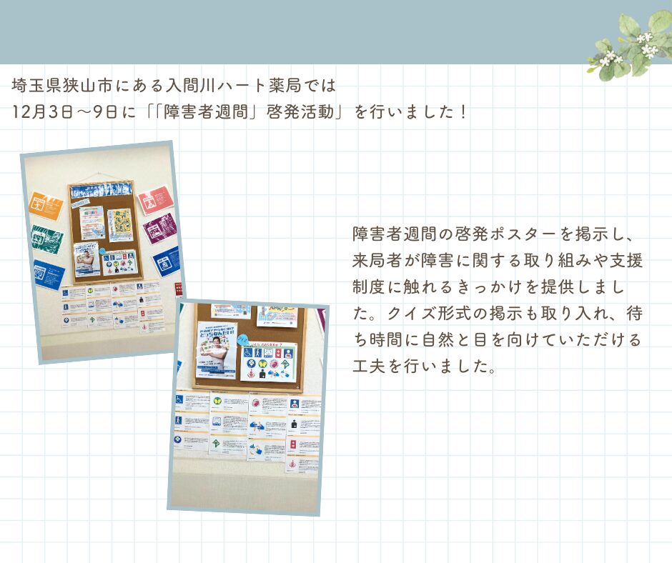 入間川ハート薬局では、障害者週間の啓発ポスターを掲示し、来局者が障害に関する取り組みや支援制度に触れるきっかけを提供しました。クイズ形式の掲示も取り入れ、待ち時間に自然と目を向けていただける工夫を行いました。
