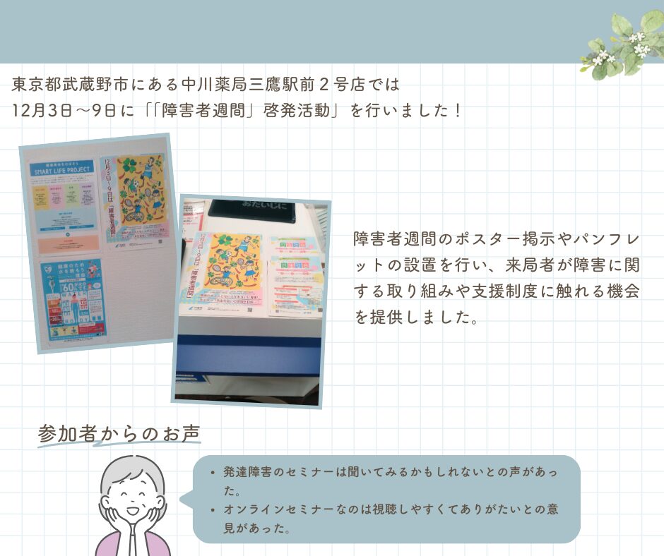 《地域イベントレポート》 中川薬局 三鷹駅前2号店 「障害者週間」啓発活動の実施