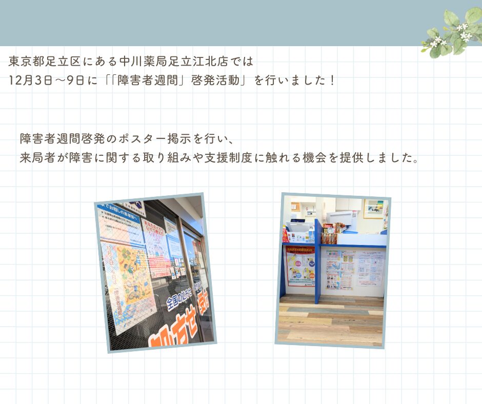 《地域イベントレポート》 中川薬局 足立江北店 「障害者週間」啓発活動の実施