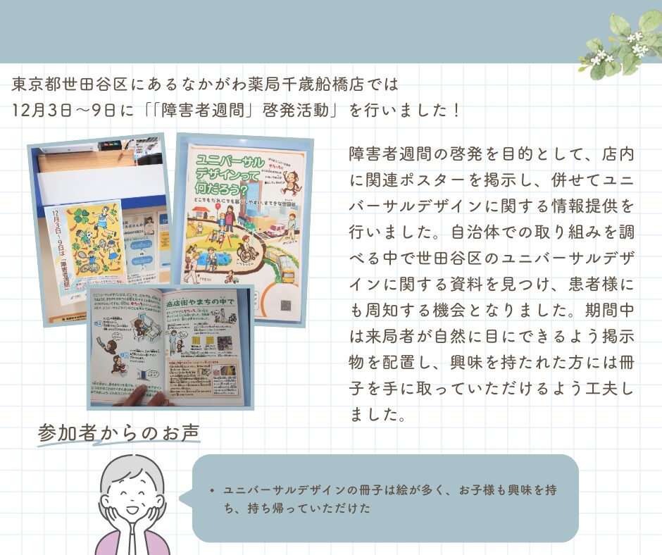 《地域イベントレポート》 なかがわ薬局 千歳船橋店 「障害者週間」啓発活動の実施