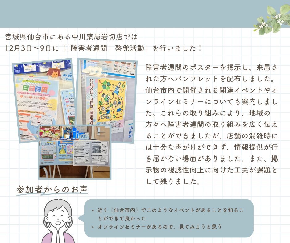 《地域イベントレポート》 中川薬局 岩切店 「障害者週間」啓発活動の実施