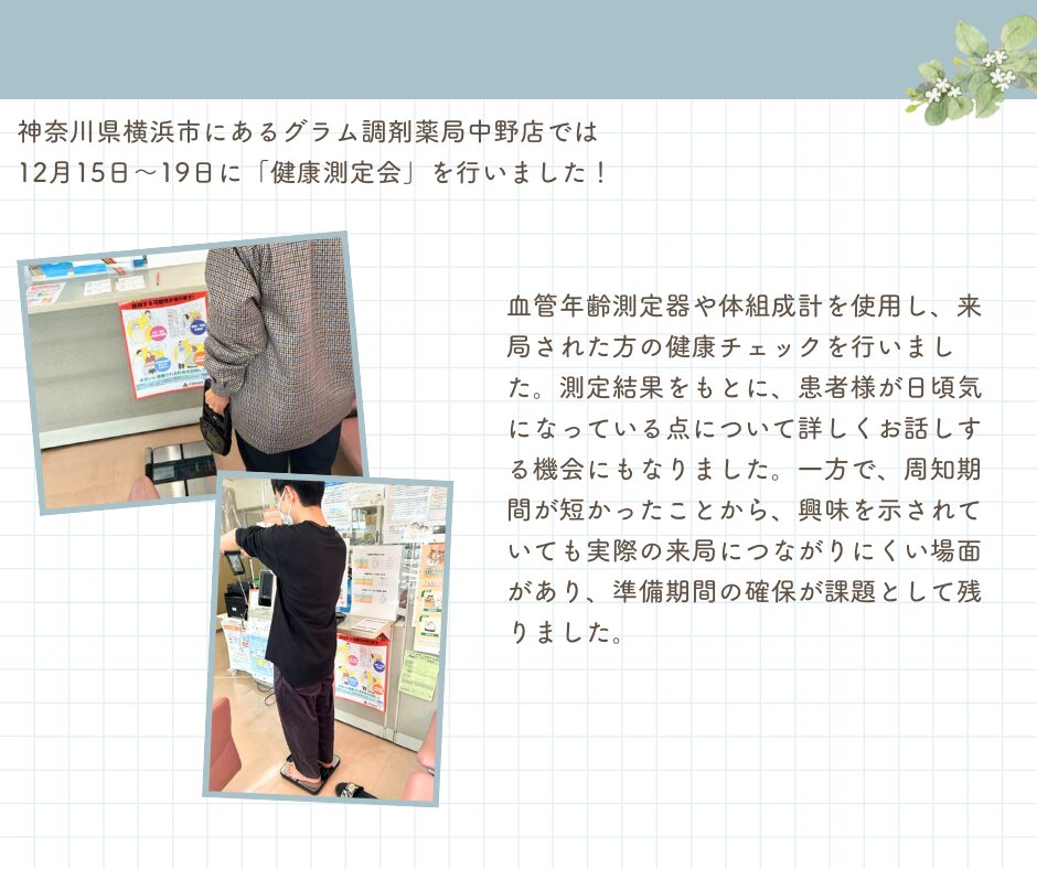 血管年齢測定器や体組成計を使用し、来局された方の健康チェックを行いました。測定結果をもとに、患者様が日頃気になっている点について詳しくお話しする機会にもなりました。一方で、周知期間が短かったことから、興味を示されていても実際の来局につながりにくい場面があり、準備期間の確保が課題として残りました。
