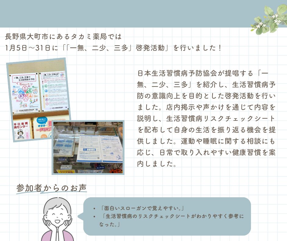 《地域イベントレポート》 タカミ薬局 「一無、二少、三多」啓発活動の実施
