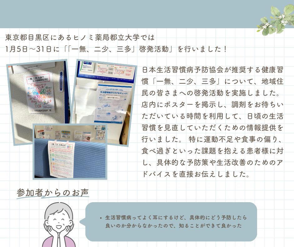ヒノミ薬局 都立大学店 「一無、二少、三多」啓発活動実施について