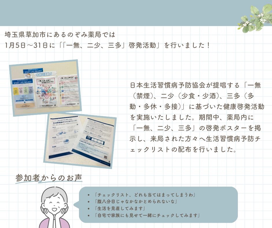 日本生活習慣病予防協会が提唱する「一無(禁煙)、二少(少食・少酒)、三多(多動・多休・多接)」に基づいた健康啓発活動を実施いたしました。期間中、薬局内に「一無、二少、三多」の啓発ポスターを掲示し、来局された方々へ生活習慣病予防チェックリストの配布を行いました。