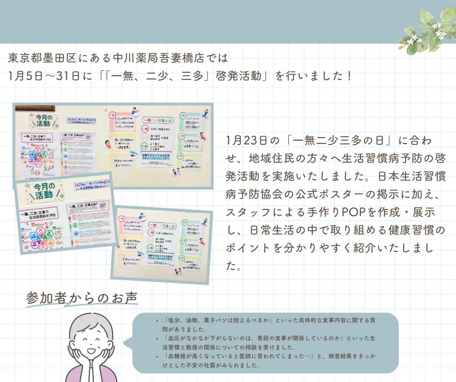 中川薬局 吾妻橋店 「一無、二少、三多」啓発活動実施について