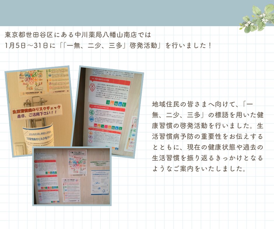 中川薬局 八幡山南店 「一無、二少、三多」啓発活動実施について