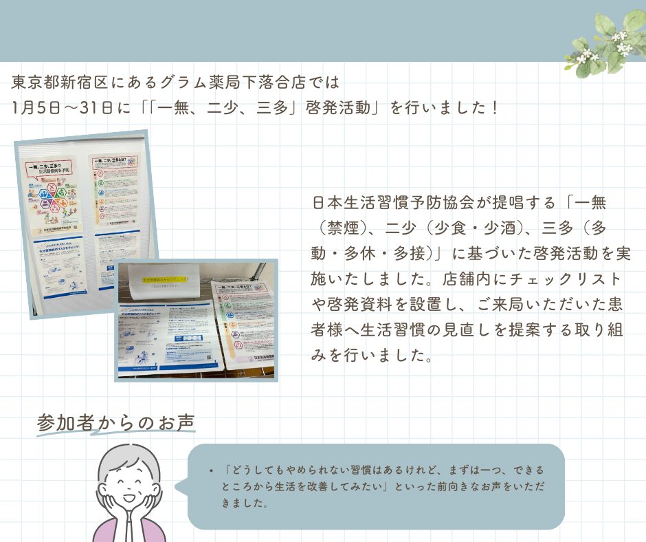 日本生活習慣予防協会が提唱する「一無(禁煙)、二少(少食・少酒)、三多(多動・多休・多接)」に基づいた啓発活動を実施いたしました。店舗内にチェックリストや啓発資料を設置し、ご来局いただいた患者様へ生活習慣の見直しを提案する取り組みを行いました。