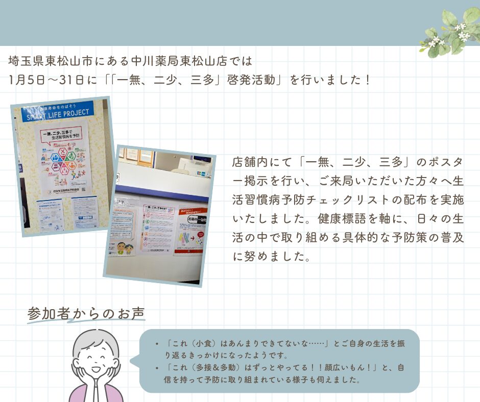 《地域イベントレポート》 中川薬局 東松山店 「一無、二少、三多」啓発活動の実施