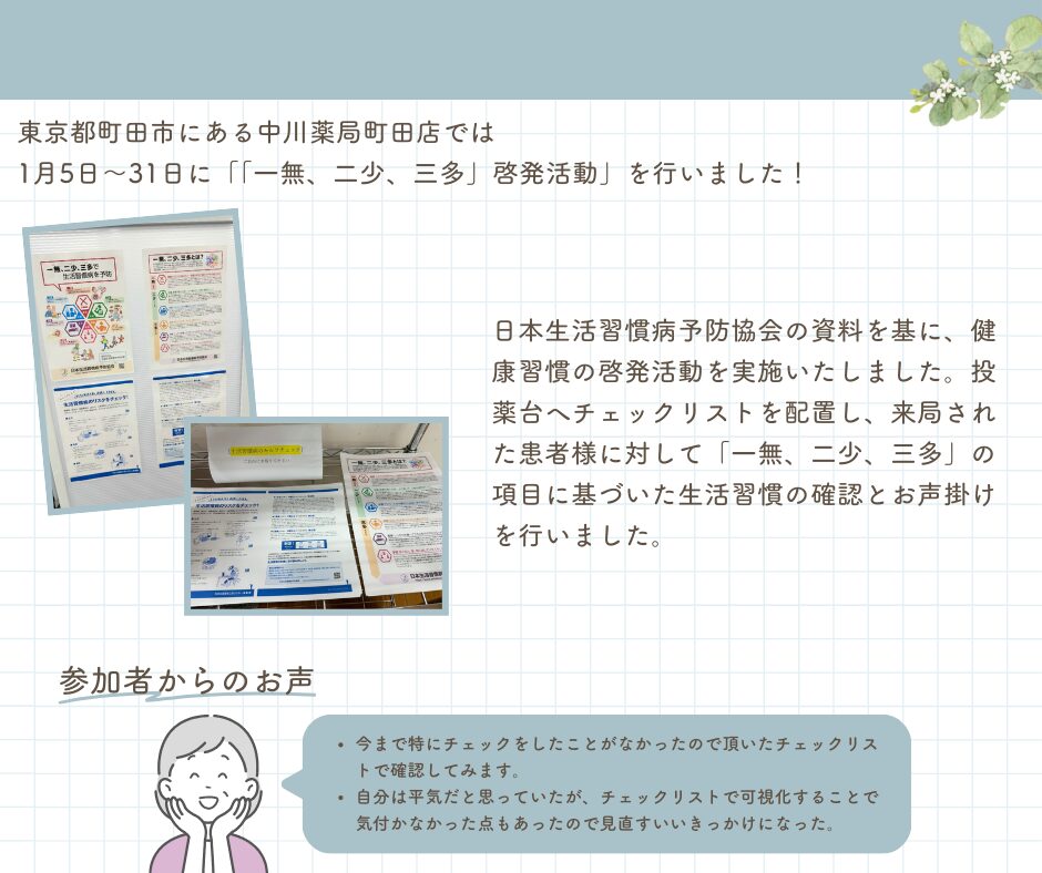 中川薬局 町田店 「一無、二少、三多」啓発活動実施について