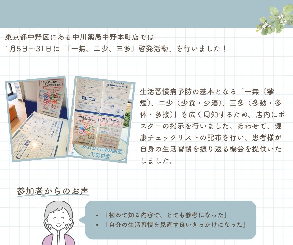 中川薬局 中野本町店 「一無、二少、三多」啓発活動実施について