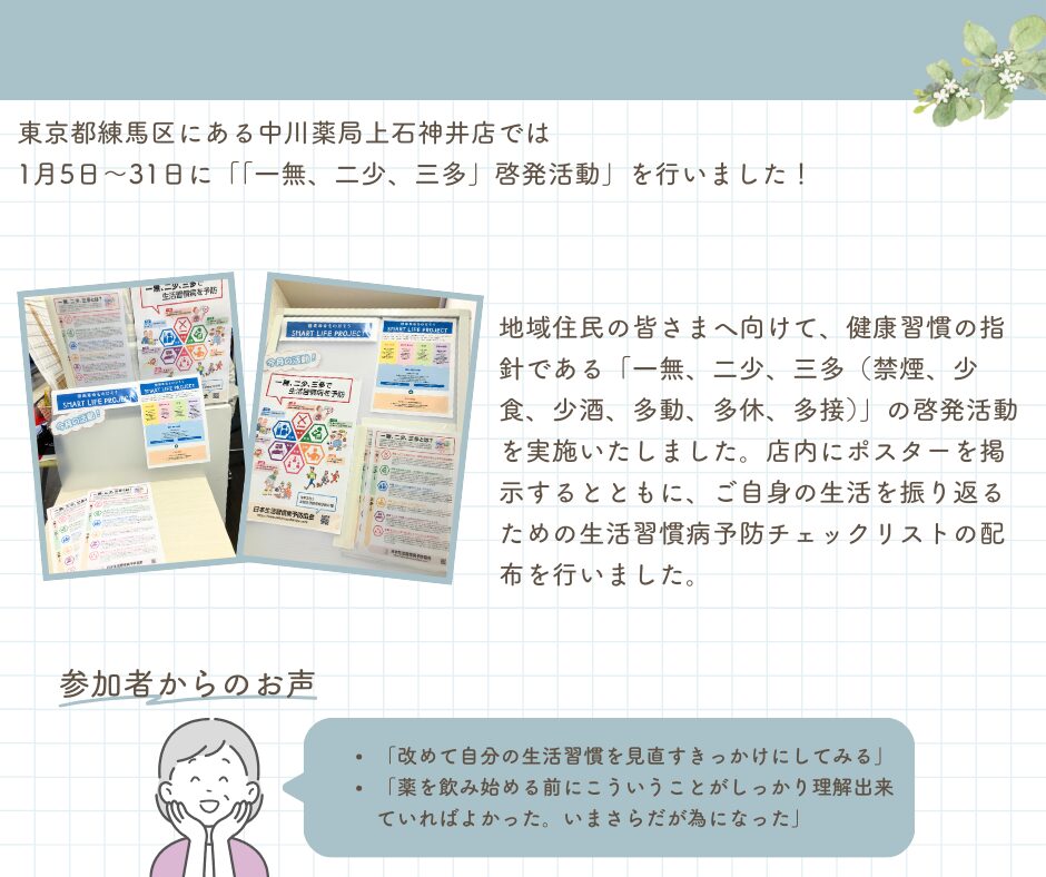 《地域イベントレポート》 中川薬局 上石神井店 「一無、二少、三多」啓発活動の実施