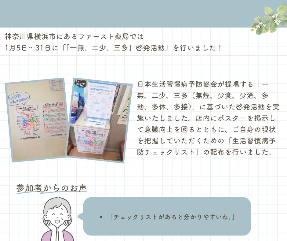 ファースト薬局 「一無、二少、三多」啓発活動実施について