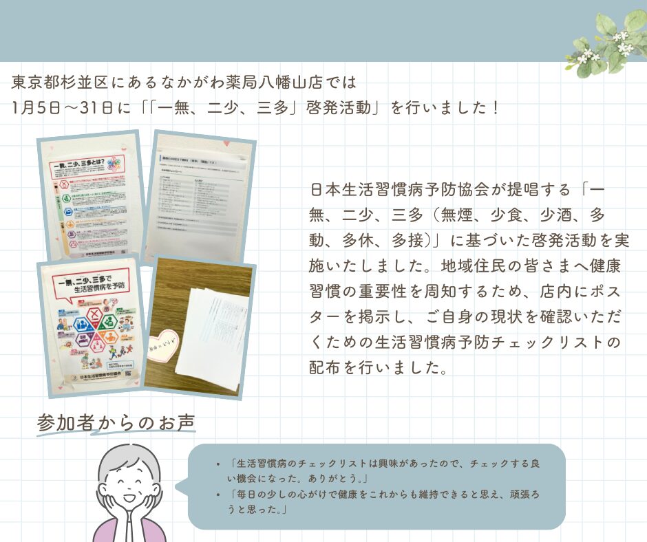 《地域イベントレポート》 なかがわ薬局 八幡山店 「一無、二少、三多」啓発活動の実施
