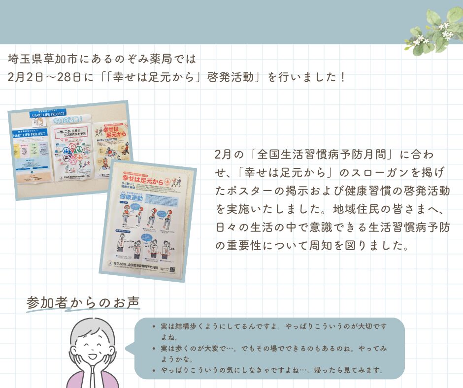 2月の「全国生活習慣病予防月間」に合わせ、「幸せは足元から」のスローガンを掲げたポスターの掲示およびチラシ配布による啓発活動を実施いたしました。投薬時の声掛けを通じて、地域住民の皆さまへ日々の健康習慣の重要性について周知を図りました。