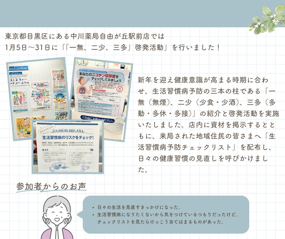 新年を迎え健康意識が高まる時期に合わせ、生活習慣病予防の三本の柱である「一無(無煙)、二少(少食・少酒)、三多(多動・多休・多接)」の紹介と啓発活動を実施いたしました。店内に資材を掲示するとともに、来局された地域住民の皆さまへ「生活習慣病予防チェックリスト」を配布し、日々の健康習慣の見直しを呼びかけました。