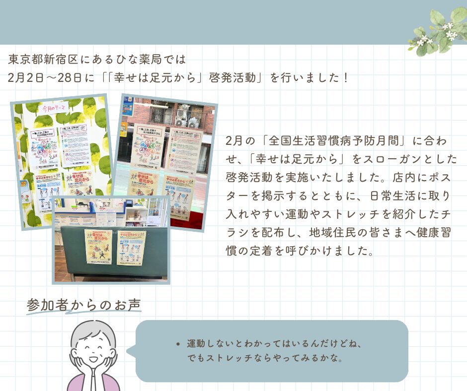 2月の「全国生活習慣病予防月間」に合わせ、「幸せは足元から」をスローガンとした啓発活動を実施いたしました。店内にポスターを掲示するとともに、日常生活に取り入れやすい運動やストレッチを紹介したチラシを配布し、地域住民の皆さまへ健康習慣の定着を呼びかけました。