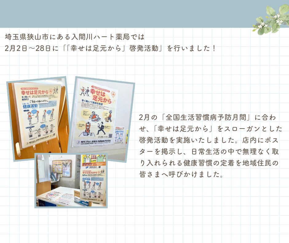2月の「全国生活習慣病予防月間」に合わせ、「幸せは足元から」をスローガンとした啓発活動を実施いたしました。店内にポスターを掲示し、日常生活の中で無理なく取り入れられる健康習慣の定着を地域住民の皆さまへ呼びかけました。