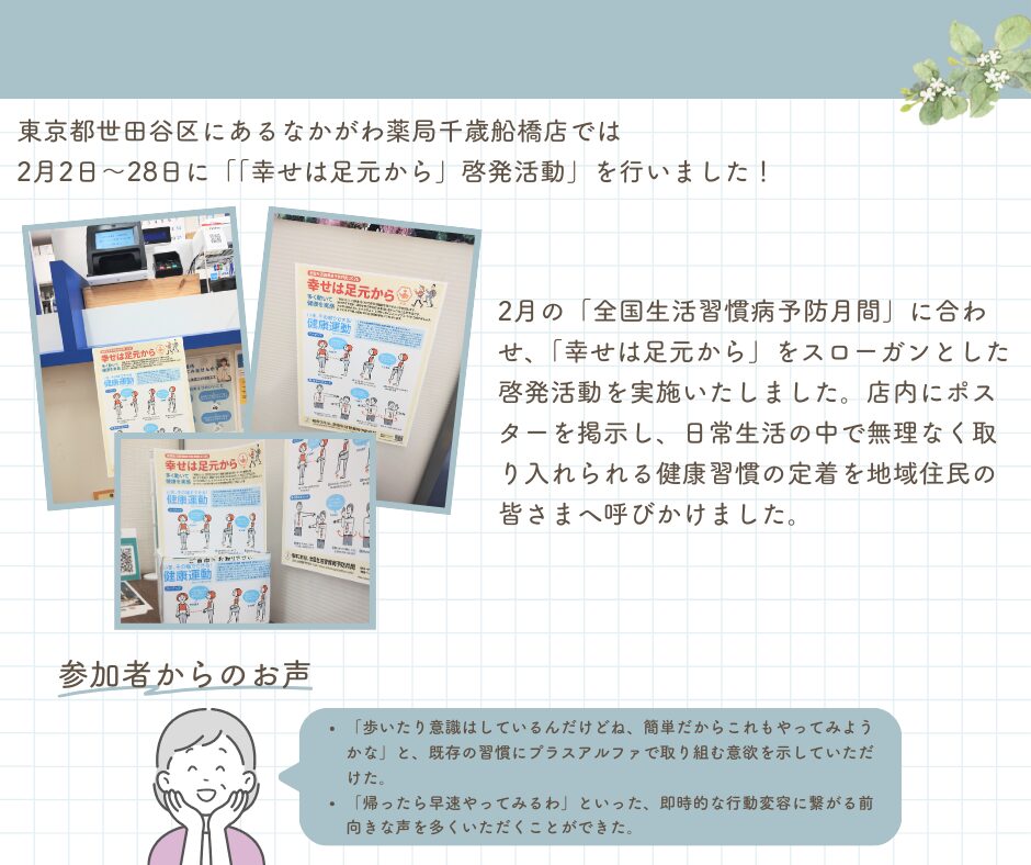 《地域イベントレポート》 なかがわ薬局 千歳船橋店 「幸せは足元から」啓発活動の実施