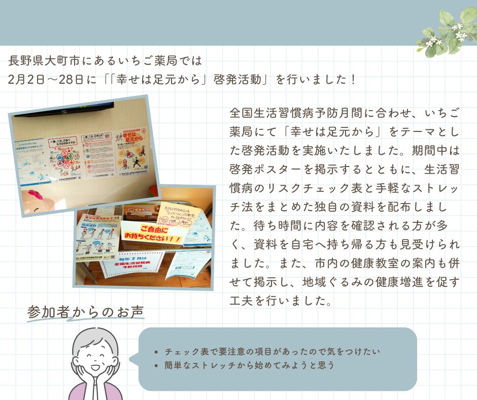 全国生活習慣病予防月間に合わせ、いちご薬局にて「幸せは足元から」をテーマとした啓発活動を実施いたしました。期間中は啓発ポスターを掲示するとともに、生活習慣病のリスクチェック表と手軽なストレッチ法をまとめた独自の資料を配布しました。待ち時間に内容を確認される方が多く、資料を自宅へ持ち帰る方も見受けられました。また、市内の健康教室の案内も併せて掲示し、地域ぐるみの健康増進を促す工夫を行いました。