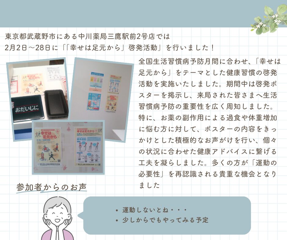 中川薬局 三鷹駅前2号店 「幸せは足元から」啓発活動実施について